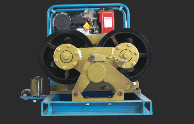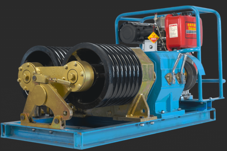 The Capstan winch Torque Master 5 Diesel version is a heavy-duty cable pulling machine featuring a distinctive teal body with black/white engine components. Designed for challenging environments, it delivers 50KN pulling force through reliable shaft transmission, making it ideal for mountainous and remote construction projects.
